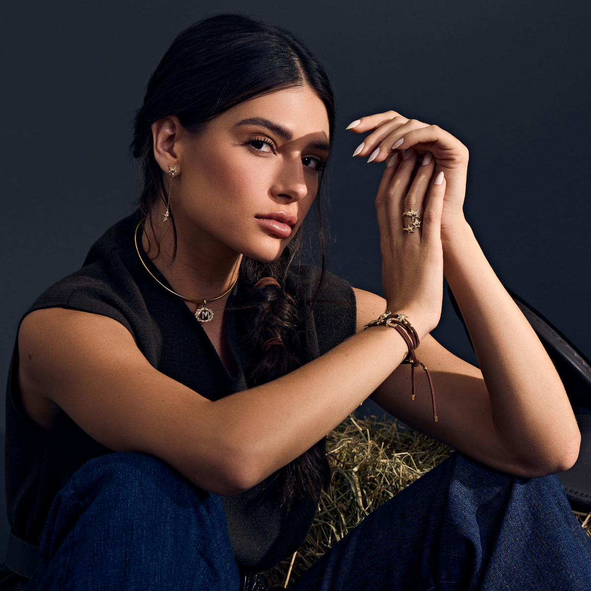 A ferradura, que atrai a sorte e simboliza proteção. A espora, que representa o impulso para ir além. A fivela, como troféu de conquistas e superações. A cruz, pela fé que sempre me guiou e as estrelas, que iluminam o caminho e celebram quem brilha com autenticidade.